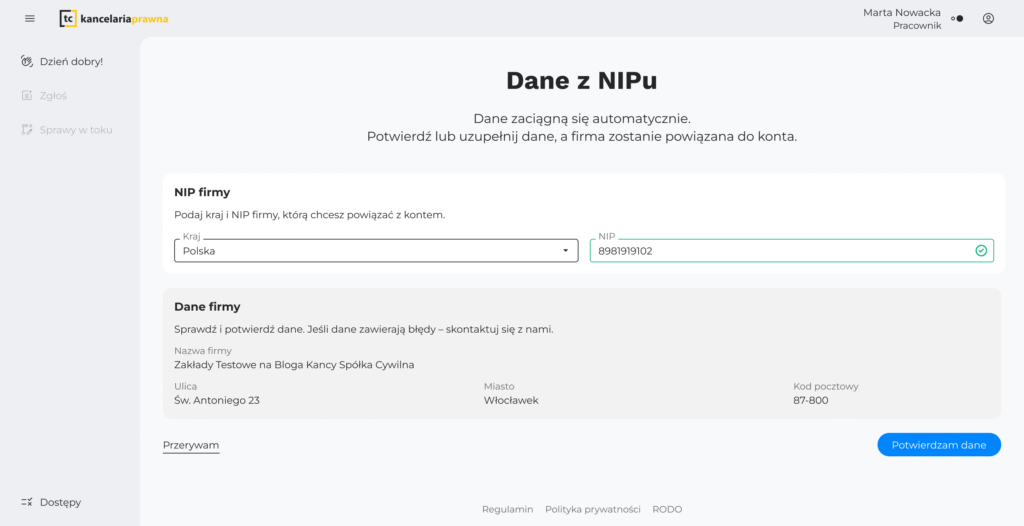 Po rejestracji w Aplikacji pierwszym krokiem jest powiązanie Twojego konta z firmą. To prosta czynność, która zajmie dosłownie chwilę – dzięki niej możemy przypisać Twoje sprawy, porady i dokumenty do właściwego podmiotu.