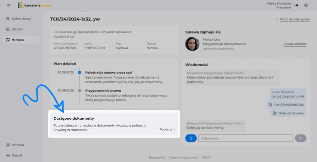 Wszystkie przekazane pliki są dostępne w boxie „Dokumenty” w szczegółach sprawy lub porady. Każdy dokument ma swoją nazwę, datę dodania i status (np. „przyjęty”, „w trakcie analizy”).