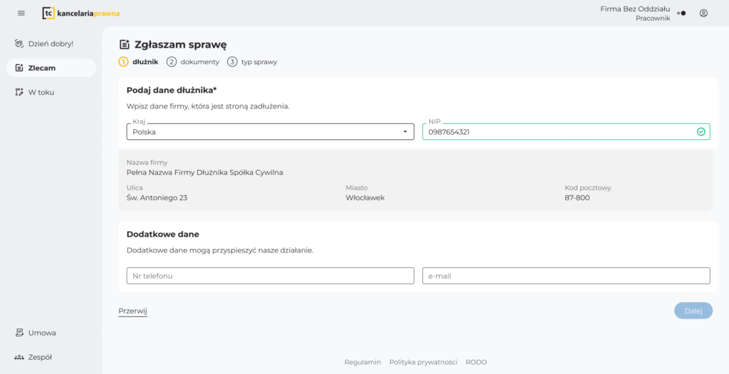 Wystarczy wpisać podstawowe informacje o firmie, która zalega z płatnością. Robisz to tylko raz, nawet jeśli masz wiele faktur do zgłoszenia.