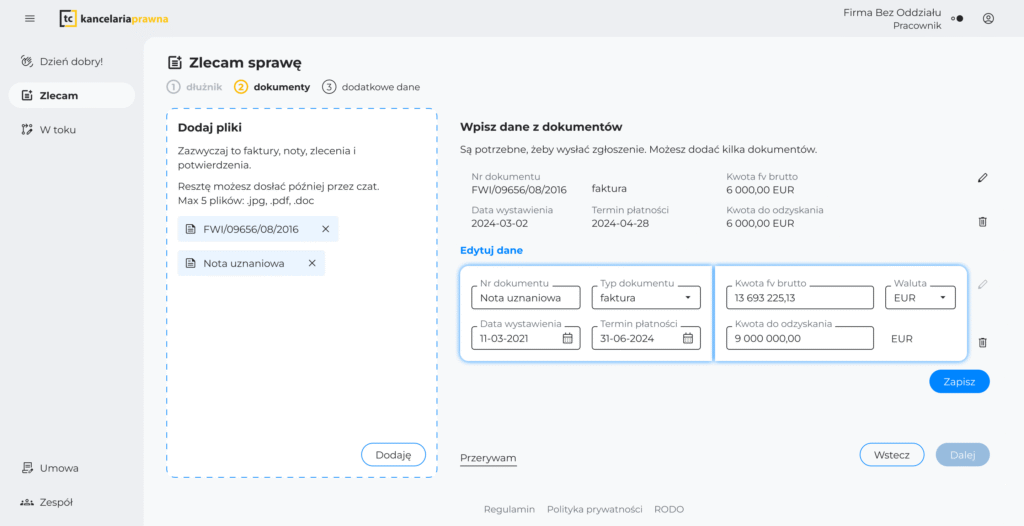 Masz kilka nieopłaconych faktur jednego dłużnika? Wrzucasz je wszystkie w jednym zleceniu. Nie musisz wysyłać każdej osobno. Możesz dodać kwoty, numery dokumentów, terminy – a jeśli nie masz wszystkiego pod ręką, nic straconego!