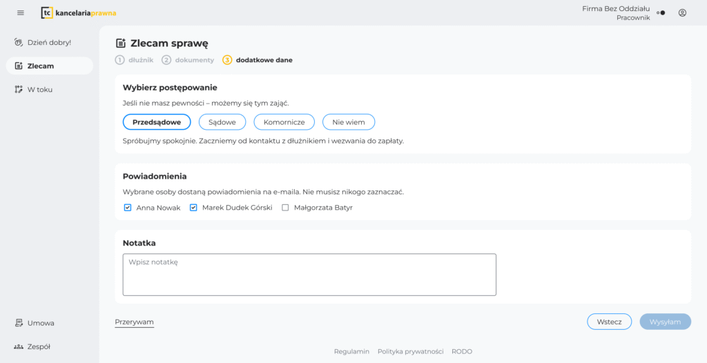 Na końcu możesz dodać notatkę, podpiąć osoby z Twojego zespołu i… gotowe! A jeśli brakuje Ci jakiegoś dokumentu – doślesz go później, wygodnie, przez czat w szczegółach sprawy.