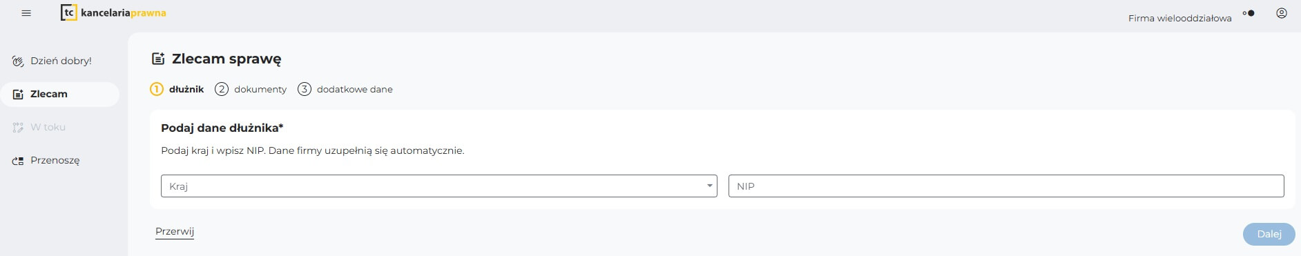 Masz dłużnika, który zalega z płatnościami? W naszej aplikacji zgłoszenie sprawy o odzyskanie należności to trzy proste kroki, bez zbędnych formalności i powtarzania tych samych danych.